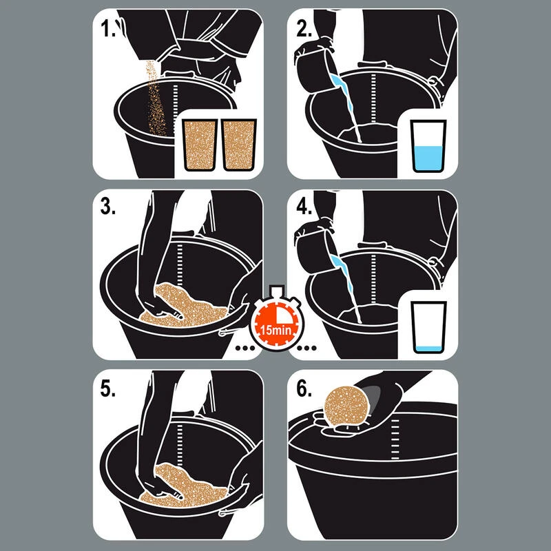 On commence tout d’abord par verser les 3/4 du volume d’eau nécessaire en mélangeant énergétiquement avec la main dans un seau rond pour permettre aux particules de l’amorce de se gorger d’eau.