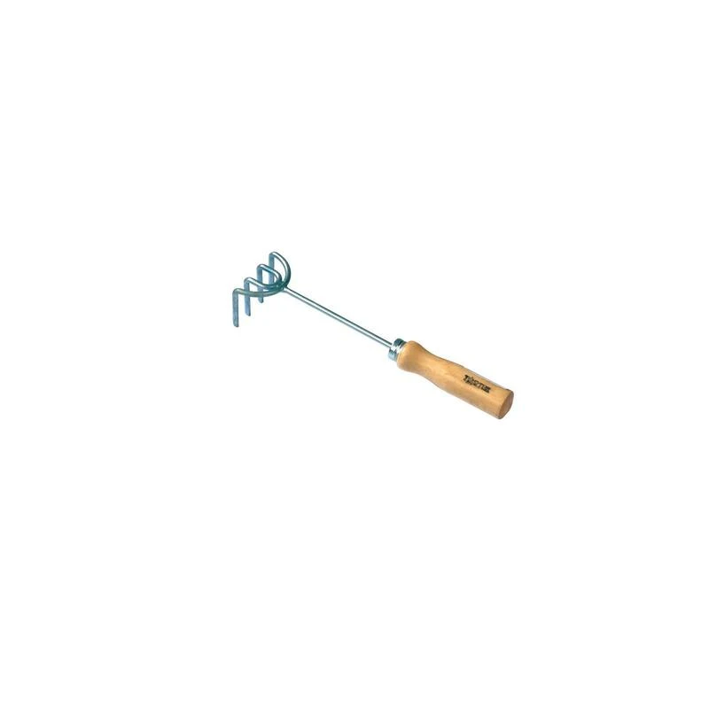 Griffe à palourdes 4 dents, poignée en bois vernis, métal galvanisé, longueur 28 cm.